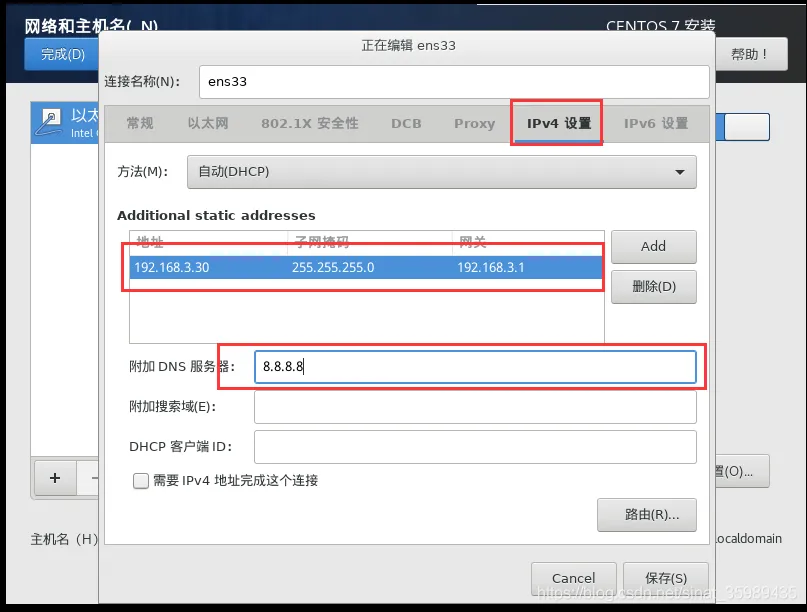 打开以太网的连接,然后点击“配置”,切到IPv4设置,输入刚才我定义的第一台虚拟机的ip地址192.168.3.30,子网掩码255.255.255.0,网关和物理机windows一样192.168.3.1(见前文),最后附加DNS服务器填入谷歌提供的8.8.8.8。