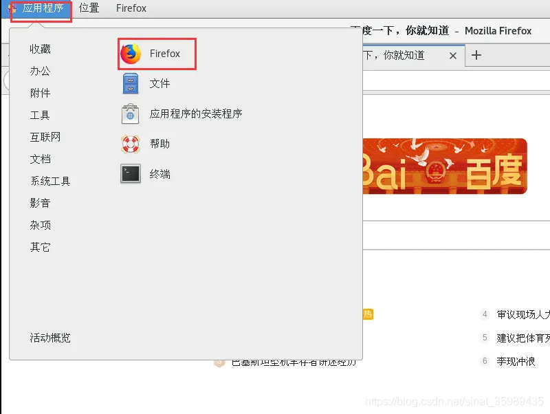 点击应用程序->Firefox,然后访问百度,如果成功则网络连接正常。