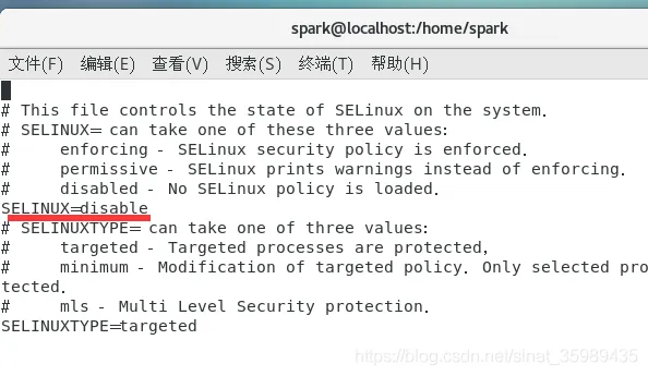 同样,用root用户在终端使用#vi /etc/SELinux/config打开配置文件,设置SELINUX=disable,注意需要重启才生效。