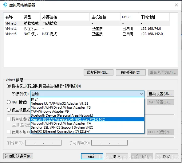 使用管理员权限打开VMware,菜单栏的编辑->虚拟网络适配器:将桥接模式的“桥接到”指向刚才记下的Realtek 8821AE,点击确定保存配置。