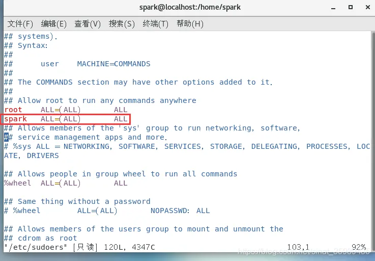后面执行中需要使用sudo命令,故将spark加入sudoers文件中,先修改配置文件的权限:chmod u+x /etc/sudoers,再使用vi /etc/sudoers打开文件,在root ALL=(ALL)ALL后加入: