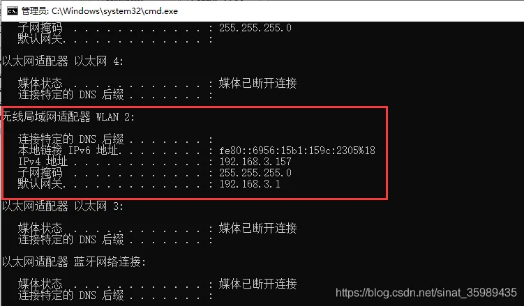 同时还要记住我WLAN 2这张网卡的网络配置信息:(windows cmd输入ipconfig查看)