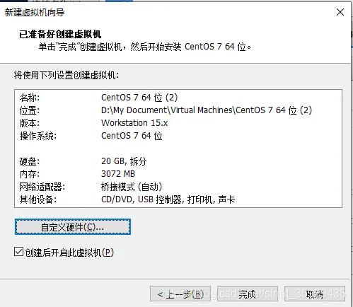 一路下一步到这里,点击“自定义硬件”把内存调成3G,网络适配器调成桥接模式,然后完成并启动。