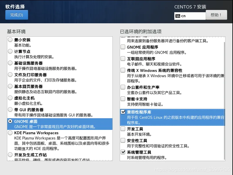 勾选GNOME桌面,然后自定义勾选需要的附加选项,我这里只选了“兼容性程序库”和“系统管理工具”,之后如果有缺少软件的话,之后再补装就好。点击左上角完成。
