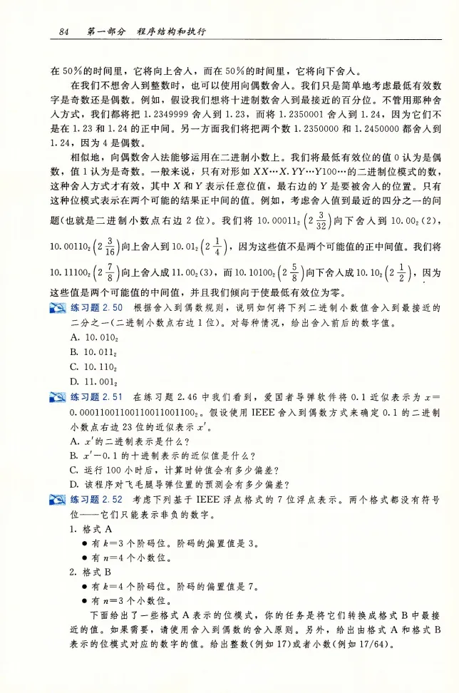 向偶数舍入下: 1.5 -> 2 -1.5 -> -2 因为1.5两边的数字是1和2,要向偶数舍入,所以取2;同理,-1.5两边的数字是-1和-2,向偶数舍入,取-2。 关于二进制向偶数舍入,书上描述为: